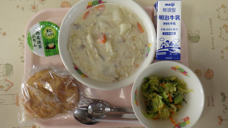 きなこ揚げパン(米粉パン) 牛乳 ゆば入り和風クリームシチュー ゆで野菜(和風ドレッシング) 抹茶プリン