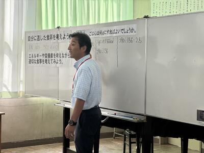 9/29(月) 1年1組で数学科要請訪問が行われました。給食のカロリー計算をしながら,ふさわしいメニューを自分たちで選択をしようという授業内容でした。生徒たちはグループで協力をして,ふさわしいメニューの選択とともに,カロリーから必要なグラム数を比例式など数学的な手法を利用して求めていました。