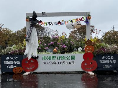 〇那須野が原公園はハロウィンの様相になっています。ところどころ紅葉も見られました。