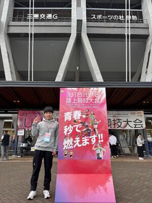 10月19日(日)三重県の「三重交通G スポーツの杜 伊勢 陸上競技場」において、「JOCジュニアオリンピックカップ第56回U16陸上競技大会」に栃木県を代表して,本校生徒が男子ジャベリックスローに出場しました。大会前日は雨模様でしたが,当日はどんよりとした天候でしたが雨は降らず,競技を行うことができました。今大会を迎えるまでの自己ベストは50m10cmでしたが、1本目に56m42cmを投げ自己ベストを更新することができました。2本目はさらに記録を伸ばし58m45cmとなりました。3本目は記録を落とし54m38cmでした。