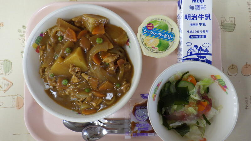 麦入りごはん チキンカレー 牛乳 海そうサラダ 和風ドレッシング シークワーサーゼリー