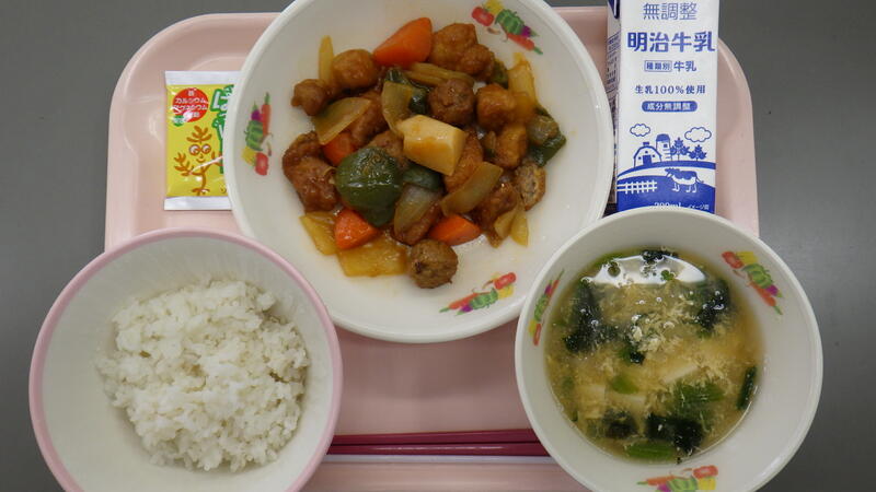 麦入りごはん ひじきふりかけ 牛乳 酢豚 ねぎと卵のスープ