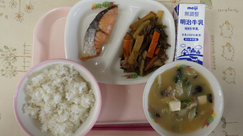 麦入りごはん 牛乳 鮭の塩焼き 茎わかめのきんぴら ほうれん草ときのこのごまみそ汁