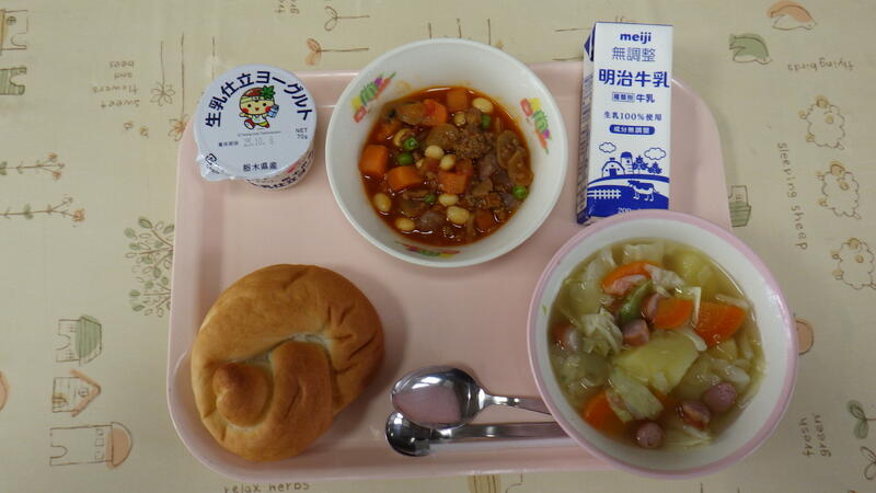 米粉パン 牛乳 チリコンカン 野菜とウインナーのスープ煮 ヨーグルト