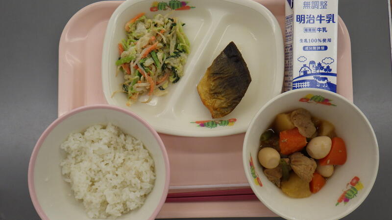 麦入りごはん 牛乳 焼き魚(ホッケの文化干し) ごまマヨあえ 豚肉と大根の煮物