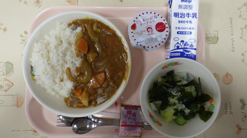 麦入りごはん ポークカレー 牛乳 こんにゃくサラダ ナムルドレッシング いちごヨーグルト