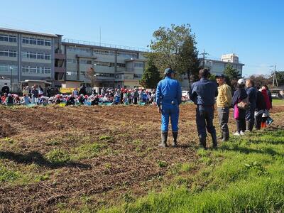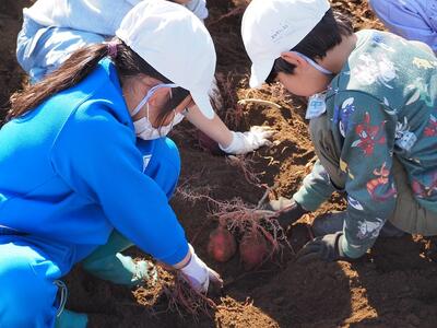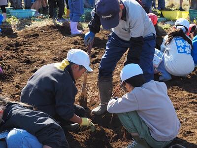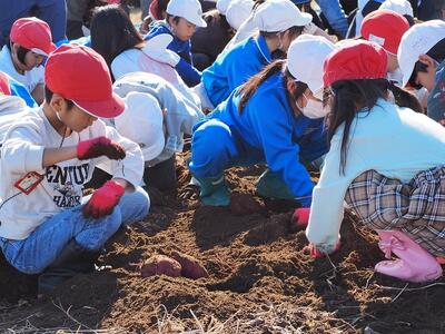 芋掘りは苗植えと同じく、縦割り班で1年生から6年生まで総出で、地域の芋レンジャーの皆様にご協力いただいて行われます。