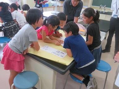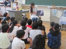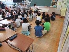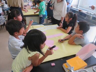 1年生が保健室の前で楽しそうにシャボン玉づくりをしています。生活科の「みんなであそぼう」の学習の一環です。子どもたちは,シャボン玉を作るための材料を自分で考えて持参してきたようです。ものによって大きさや数の違うシャボン玉ができて,子どもたちも驚いているようでした。