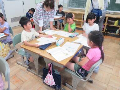 6年生の教室では外国語活動の授業が行われていました。「町にあるものを英文で書こう」がテーマです。初めに,自分たちが住む街にはどんなものがあるか,カードを用いながら先生と対話をします。「ある」ものと「ない」ものを区別しながら,「ある」ものについては「いくつある」のかも確かめながら対話が進みます。子どもたちは自主的に発言しています。表現に慣れてから,それぞれに英文を書き始めました。