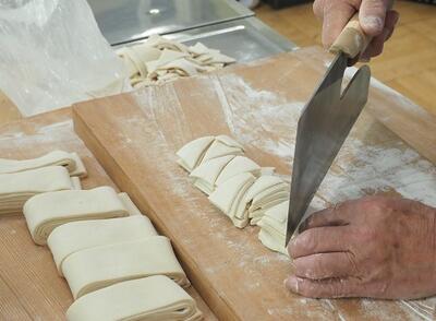 つくるのは「船頭鍋上り」です。船頭鍋には上りと下りがあって、大変な川上りをしてきた方々にふるまうため、味噌仕立てで鮭が入ります。饂飩は三角形に切ったものが使われていたということで、今回、それにならってつくりました。