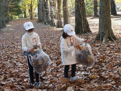 今日の3時間目に、1・2年生で来週収穫祭のサツマイモ焼きで使う落ち葉を拾いに、学校近くの公園に行きました。