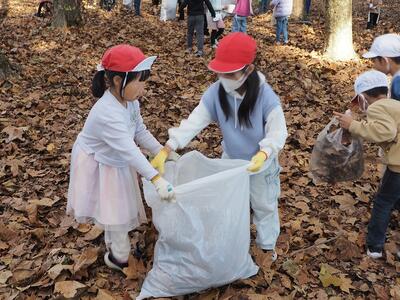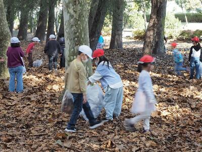 上の方に積もった乾いたはっぱを集めるよう伝え、子供たちが一生懸命ひろいました。