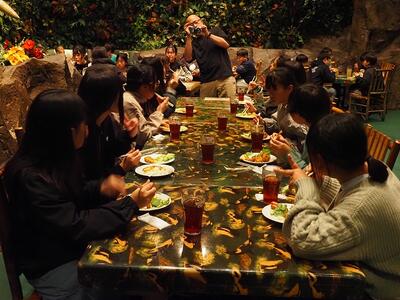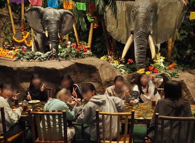 夕食は、昨年はホテルでしたが、今年はディズニーリゾート内のレインフォレストカフェでした。独特の雰囲気のお店でしたが、みんな楽しみながら?食事することができました。