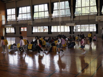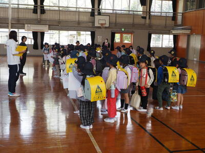 ここ数年は、ふれんず(学童保育施設)へ行くお子様も増えました。体育館で班を確認した後、外で並ぶ練習もしました。