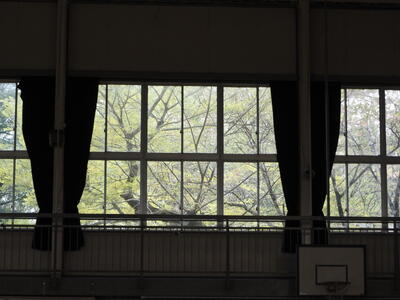 体育館から見える新緑と散る桜。美しいです。ハナミズキが咲き始めました。