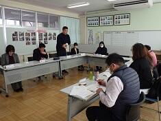 給食の配膳を見学した後、給食の試食をしていただきました。次に、体力、保健、給食の各主任から、本校児童の実態について説明しました。