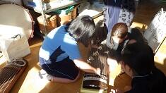 1組も2組も、友達同士で「七七八 七七八~」とどの弦を弾いたらよいかを口ずさみながら、4~5人のグループで体験しました。