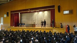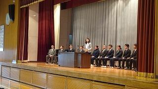 また、各学年の代表生徒から今年度を振り返っての発表がありました。2人ともこの1年間の学習や生活面での頑張ったことや成果と課題、そして来年度に向けて「自分に厳しく勉強と部活動の両立を目指したい」「目標達成に向かって大いに努力したい」など、自分の考えや進級に向けた決意を述べ、立派に責任を果たすことができました。