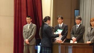 式に先立って「宮っ子心の教育表彰」がありました。 本市では児童生徒に規範意識や思いやりなど,豊かな心を育むため「宮っ子心の教育」を推進しています。その中で,「宮っ子心の教育表彰・教育長奨励賞」を設け,本市の子ども達の行動規範である「宮っ子の誓い」~「きまりを守る素直な心」「よわい人をいたわる心」「美しいものを愛する心」「夢を抱いてやりぬく心」を実践している児童生徒を学期ごとに表彰しているものです。
