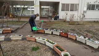 第79回卒業式に備え、緑化委員の生徒で通路や体育館周辺のプランターの水やりを行います。地域協議会・PTAボランティアの皆様、生徒の皆さんお疲れ様でした。休日にもかかわらず、ご協力いただきありがとうございました。