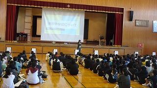 生徒会執行部による学校紹介です。6年生の皆さんは興味深く、聴いていました。