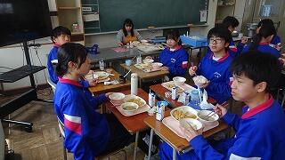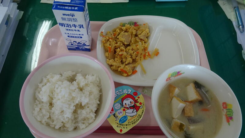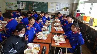 10日(火)は第79回卒業式、本日はお祝い給食。赤飯、とんかつ、磯辺和え、お祝いケーキや紅白すまし汁を味わいながら、 おいしくいただきました。