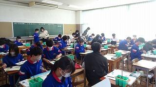 みそづくりの説明やみそが完成するまでの話の後に、班ごとに仕込み体験を行いました。仕込んだ味噌(合計15kg)は熟成させるため、一旦、宮島醤油さんに預け、2月4日に出来上がり予定です。できあがった味噌は、給食で使用することになってます。
