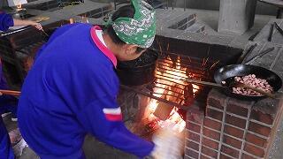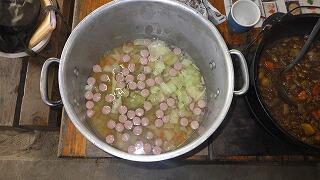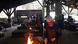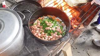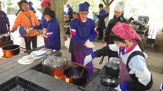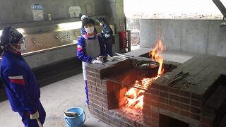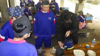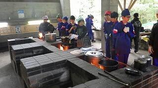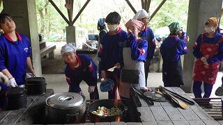 野外炊飯の様子。カレーやビビンバを皆で協力して作りました。
