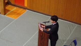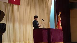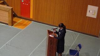 同窓会長様から卒業生へのお祝いの言葉や激励、同窓会の意義等の説明を受け、同窓会年次委員の紹介と抱負を述べた後、新入会員の代表の挨拶がありました。皆、清原中生としての自信と誇り、そして同窓会や成人式への期待や未来に向けて、力強いコメントを述べるなど、とても立派な発表でした。