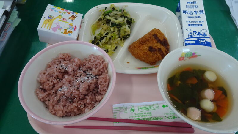 10日(火)は第79回卒業式、本日はお祝い給食。赤飯、とんかつ、磯辺和え、お祝いケーキや紅白すまし汁を味わいながら、 おいしくいただきました。