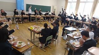3月4日(水)、3年生にとっては、給食も残り3食となりました。3年生の給食の様子を紹介します。楽しみにしていた給食も残り少なくなり、さみしさを感じます。毎日給食をつくっていただいている調理員さんに感謝です。ありがとうございます。