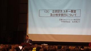 保護者会では、校長・学年主任(学習内容定着度調査・生活のアンケート分析・スマホ,SNSについて)の挨拶後、「立志記念スキー教室及び修学旅行について(概要と旅行積み立て)」、1年間を振り返って各クラス学級委員からの報告、1年間の学校学年行事を振り返るスライド視聴を行いました。