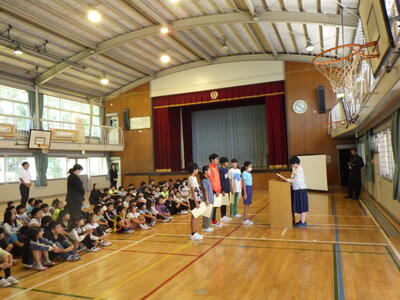 6名が全校児童の前で,頑張っていることや頑張りたいことなどをスピーチしました。