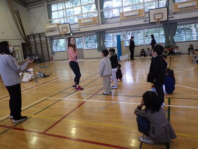 まず,体育館で全員で「じゃんけん貨物列車」をしました。