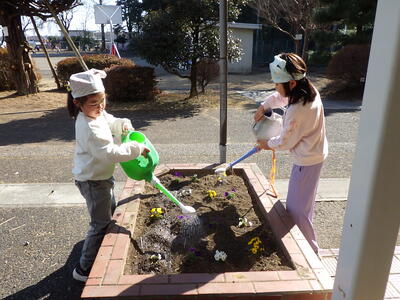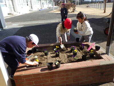 業間,校庭で遊んでいた1,2年生が進んで植えるお手伝いと昼休みに水やりをしてくれました。