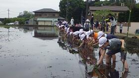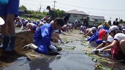 地域の斎藤豊さんの田んぼを学校農園としてお借りし,全校生で田植えをしました。斎藤さんから苗の植え方をご指導いただいた後,いよいよ田んぼへ。3・4年生に続いて,1・6年生と2・5年生はペアを組んで行いました。みんなていねいに苗を植えることができました。これから観察を続け,秋には稲刈りを予定しています。齋藤さん,船頭まつりGの皆さん,ご指導・ご協力ありがとうございました。