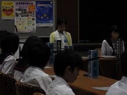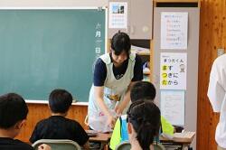 給食後,ランチルームでスクスクタイムが行われました。栄養士,養護教諭,体育主任から夏休みの生活で心がけることの話がありました。