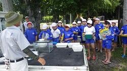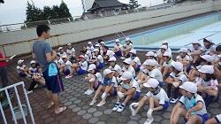 【石川会長さんのごあいさつ】 【プールに移動し,当番の仕事を確認】