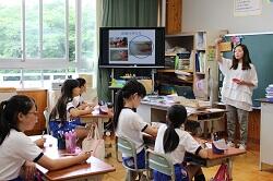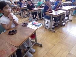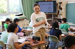 ベトナムから名古屋の大学に留学している,グェン スアン バークさんが宝泉寺にホームステイしており,3日間,本校で子どもたちと交流することになりました。初日は,ランチルームで子どもたちにバークさんの紹介が行われ,その後,1年生と給食を食べました。3日間の中で,各学年の授業に参加したり,KASAで子どもたちと過ごしたりする予定です。