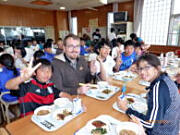 通訳はエミリー先生 | 4年生と一緒に・・・ 「チーズ」でOK?? | 給食を一緒にいただきました |