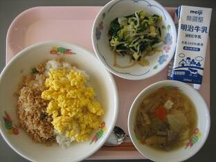 今日の給食は,二色丼,おひたし,まろやか味噌汁です。