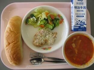 今日の給食は,はちみつパン,鶏肉のパン粉焼き,ブロッコリーサラダ,ミネストローネです。
