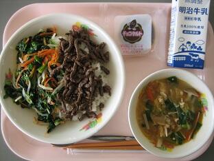今日の給食は,ビビンバ丼,坦々春雨スープ,チョコタルトです。
