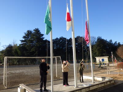 6年生は朝の寒い校庭で手がかじかみながら,国旗・市旗・校旗を青空に向かって揚げる仕事を行っていました。