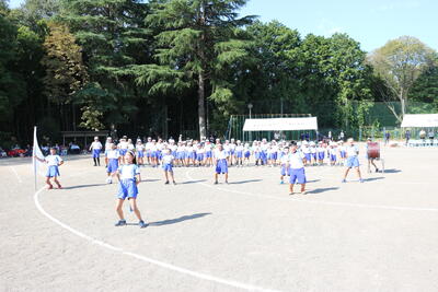開会式後の競技1番はラジオ体操第一です。英語の説明を聞きながら,6年生のお手本を見ながら行いました。