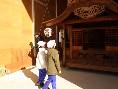 学区にある板戸町集落センターに行って,昔から伝わる天棚と板戸河岸について,地域の方からお話を伺ったり,実際に天棚を見せてもらったりしました。