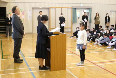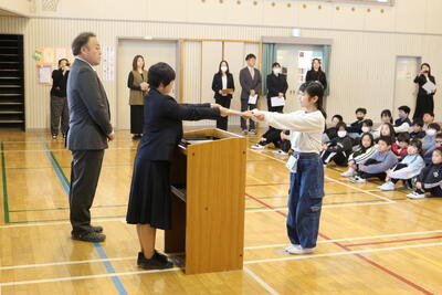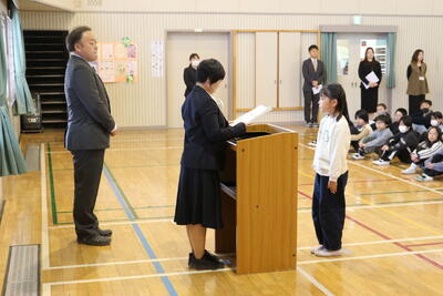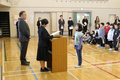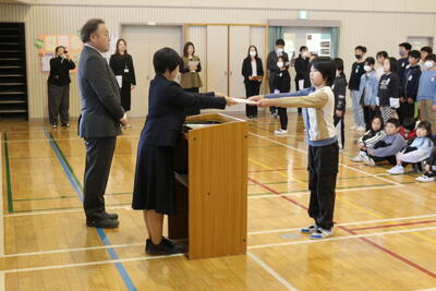 修了式では,各学年の代表児童に修了証を授与し,全員が4月1日から1つ上の学年に進級します。
