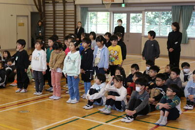 在校生として式に参加する4,5年生も口をしっかり動かして6年生に向かって台詞を言うことができました。