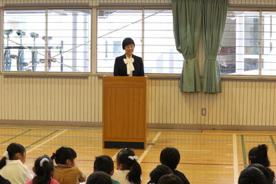 次に,校歌を歌い,児童指導の先生から「春休みの生活について」の話を聞きました。