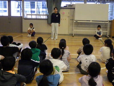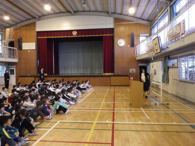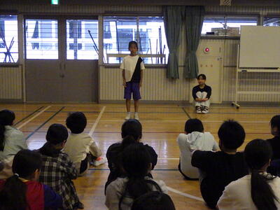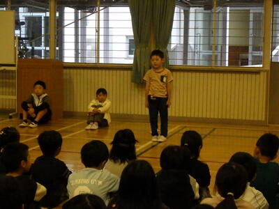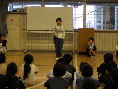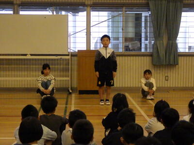 まず,1年生から1人ずつ各学年の児童代表スピーチ「がんばっていること」「がんばりたいこと」